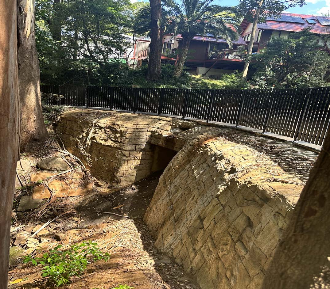 The Balfour Rd. Austinmer retaining wall reconstruction involved the remediation of a partially failed dry stacked stone retaining wall that bisects a concrete/ brick box culvert using shotcrete in combination with soil nails.
